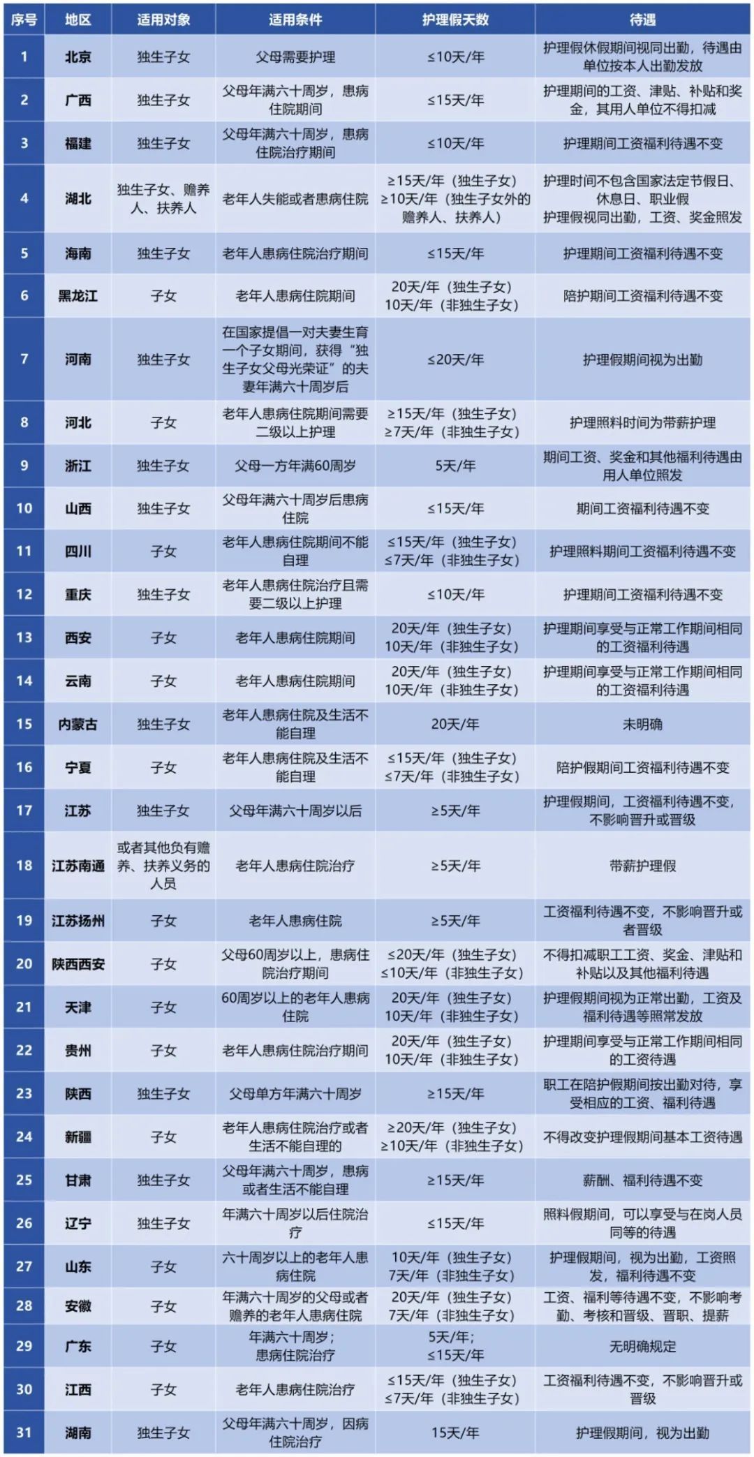 其中,值得注意的是,还有10余省份,非独生子女同样可享受护理假,不过假期天数少于独生子女。例如,山东、安徽、宁夏、四川、江西、湖北规定,非独生子女每年可获得最多7天护理假,天津、云南、黑龙江、贵州、新疆达到10天。